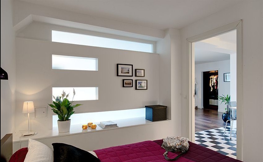 臥室里的純色床品更能打造浪漫的氣息,床頭的燈具亦是極簡的,綠色是每個空間都必要的。
