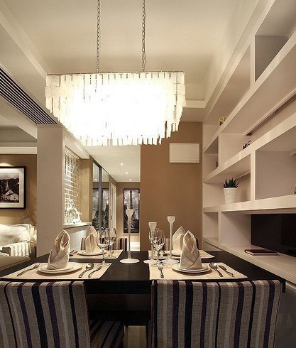 餐廳的燈具像一場華麗的盛宴,在平凡的簡約空間里變得精致時尚。餐桌椅都是常見的,色彩的不同搭配,卻是搭配出一個時尚的空間。