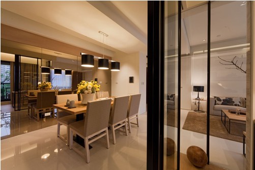 餐廳是家居生活的心臟,不僅要美觀,更重要的實(shí)用性,整體性。餐廳的燈光很重要既不能太強(qiáng)又不能太弱,燈光則以溫馨和暖的黃色為基調(diào),頂部做了簡(jiǎn)單的吊頂。由于空間不是很寬,因此把餐區(qū)面墻做成一整面墻的鏡子,讓人坐在其中不覺得壓抑,有了這面鏡子,更顯得餐區(qū)有了生氣,餐區(qū)的地面采用的是米白色拋光磚。