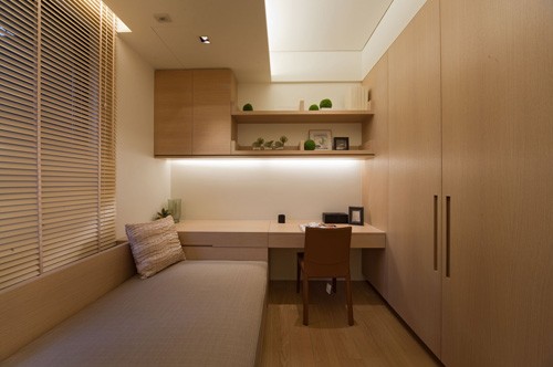 書房兼書房,此房間做了簡(jiǎn)單的天花造型,頂上藏?zé)魩?。由于空間不是很大,房間做了一排壁柜就只能放一張小床了。有了這間小房間讓親戚朋友來家可以做一個(gè)睡房,沒客人就把它當(dāng)書房,既方便又使用。