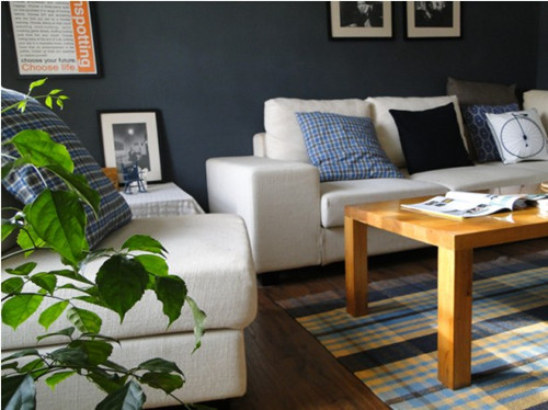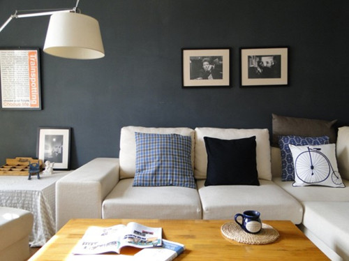色彩將客廳空間里裝飾的層次分明,沙發(fā)映稱著墨藍的墻面,顯得干凈明了。有時候時尚就是這么簡單。