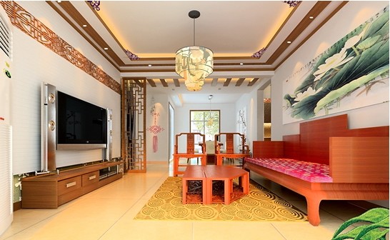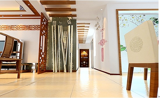 這張是本案例的進(jìn)門視角效果圖,進(jìn)門背景用的是中過古文化中的甲骨文墻紙做裝飾,加上帶有中國古文化的竹子的擺設(shè),充分的體現(xiàn)出了中國傳統(tǒng)文化的優(yōu)雅氣質(zhì),屏風(fēng)是中國古元素在裝飾上面用的比較多的隔斷裝飾,在電視背景邊的裝飾屏風(fēng)隔斷是分開了走道區(qū)域與客廳區(qū)域的空間,再加上帶有木質(zhì)格柵的頂面效果充分的體現(xiàn)出了中國的古文化的底蘊(yùn),走道的延伸式格柵吊頂充分的規(guī)劃出走道的自然效果!