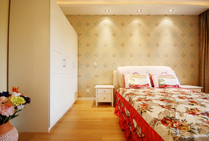 暖暖的臥室里,田園風(fēng)格得以體現(xiàn),簡潔諾大的衣柜可以有序的擺放任何衣物。