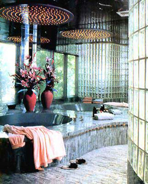 您是否也想象過自己能擁有一間如此豪華的浴室呢?玻璃鏡墻、滿天星式圓盤頂燈的選用,不僅拓展了空間,更增添了浴室的豪華氣派。其實(shí),您也不妨試一下,并非要花費(fèi)很多錢的。 (上海裝潢網(wǎng))