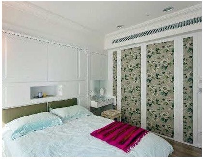 床頭嵌入式背景墻柜設(shè)計(jì),合理利用空間的同時更是很好的收納空間,可容納很多雜物。一側(cè)的歐式小凳延續(xù)了客廳的歐式田園風(fēng)格。