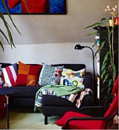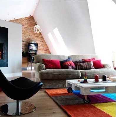 客廳布置設(shè)計的豐盈而立體,糖果色的靠枕,彩色拼接地毯,出眾的色彩搭配立刻讓灰色的沙發(fā)外觀變得豐滿起來,使得客廳盡顯歡快本色。