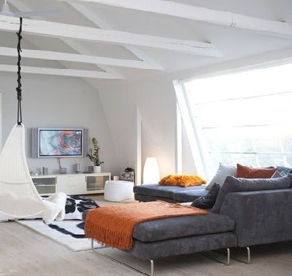 大面積留白的空間,放著一款低調(diào)雅致的灰色沙發(fā),簡單的布置顯得空間干練/簡約。為了讓整體氣氛和諧,明艷,用色上選擇了一抹橙色點綴,增加空間的時尚感。