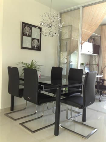 走進餐廳黑色的餐桌椅,看起來沉穩(wěn)、嚴肅,但是卻不失高貴,白色的線簾還有綠色的植物,好清新的餐廳,看后有心動的感覺不。