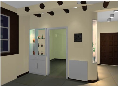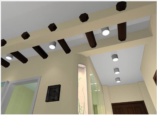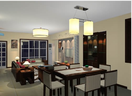 這頂上造型還挺有的個性的哦,設計師用中式六邊木梁來掩飾原來過梁的突出部分,再利用小圓柱體造型的燈飾,這樣的結合很完美。原來的缺陷在這樣的設計下別有一番風味!