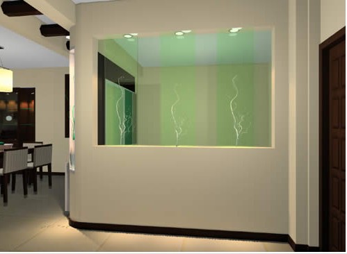 一進入戶就看見了廚房的淡綠色玻璃藝術隔墻!
