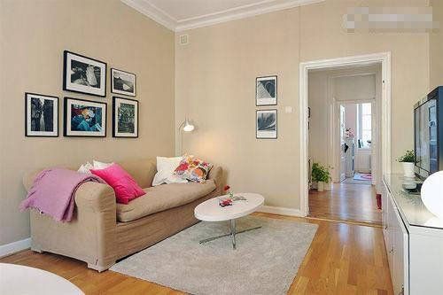 這個淡淡茶色的墻壁與深色的沙發(fā)相呼應(yīng),有著層次分明的搭配感。而顏色艷麗的軟軟靠墊則又是一鮮明的跳躍感。茶幾是簡約風格的,連同短毛地毯也是簡潔的裝飾物。電視柜則是一個很好的收納空間,可以有效的收放家里所有的影碟,樂盤等等。這個房型實用面積不超過60平,風格有點北歐的感覺,不過卻是用現(xiàn)代的手法裝修,在軟裝飾上借用了北歐,這樣可以放大利用空間。