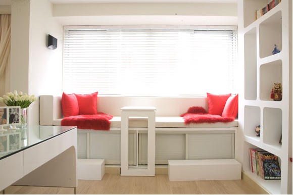 功能區(qū)規(guī)劃上,將與客廳相連的房間打通,用沙發(fā)作為隔斷,劃分出會客區(qū)及休閑閱讀多功能區(qū)??臻g暢通,也沒有影響使用功能。色彩上依然選擇紅與白的搭配。