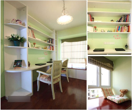 考慮的對(duì)眼睛的好處,書(shū)房背景墻面選用了大量的淺綠色,搭配上深色的實(shí)木地板,給人一種厚重感。在這樣光線自然的書(shū)房里學(xué)習(xí),愜意舒適。