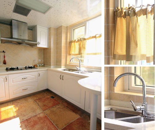 復(fù)古的地磚,白色的櫥柜,這里色彩的作用至關(guān)重要。暖暖的土黃色調(diào)是鮮明的主色,飄窗的小窗簾流露出田園風(fēng)情,表達(dá)出鄉(xiāng)村田園的簡(jiǎn)樸和溫馨。