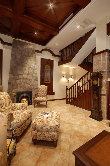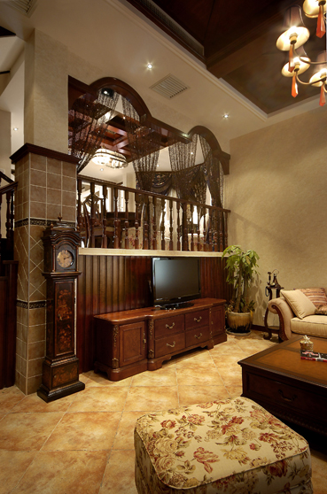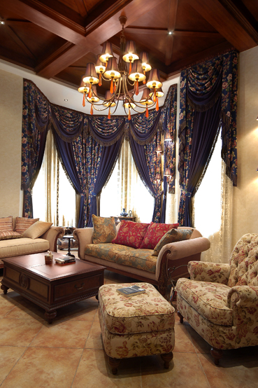 如前所述,此空間定性為美式風(fēng)格.那么用材便有了范圍—-磚,紙,木,布藝等.便捷,隨意,休閑是美國人居最為強(qiáng)調(diào)的,于是,此空間也不無例外.如客廳和餐廳極為突出,整個環(huán)境決不刻意賣弄性的作無畏裝點.當(dāng)中強(qiáng)調(diào)交通流線的合理,起居休閑時的舒適和諧,功能布置的實用于方便.為了提煉出整個空間的層次與文化積淀,用才上,特別是對于磚的取材,考慮的都是仿舊仿古系列,好像在訴說這是一個家族一代一代輝煌的生活傳承.縱閱整個別墅,窗簾布藝在此當(dāng)中起到了不可忽視的作用,從最基礎(chǔ)的為每個特性空間調(diào)節(jié)人居生活認(rèn)為合適光度之外,他們自身獨特的花紋,掛式以及色感為這個以美式定義的空間增添出浪漫,個性,舒適大氣的視覺美感.在家具陳列選擇上,強(qiáng)調(diào)整體風(fēng)格的統(tǒng)一—大氣,隨意,輕松.每個個體家具表現(xiàn)的氣質(zhì)同樣非常獨到,同時也非常配合的表現(xiàn)出懷舊與人文傳承的個性.
