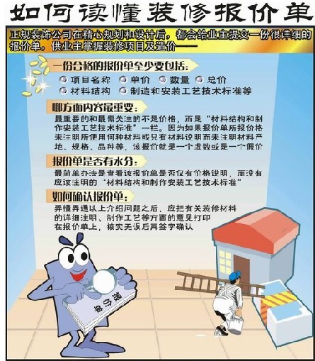 這是因?yàn)椋彝パb修也應(yīng)有一個(gè)造價(jià)預(yù)算的程序:材料費(fèi)、施工費(fèi)、管理費(fèi)、利潤(rùn)等都應(yīng)該明確。而沒有信譽(yù)、質(zhì)量和服務(wù)保證的裝修公司或施工隊(duì)往往采取一口報(bào)價(jià)或低于別人報(bào)價(jià)的做法承攬業(yè)務(wù)。