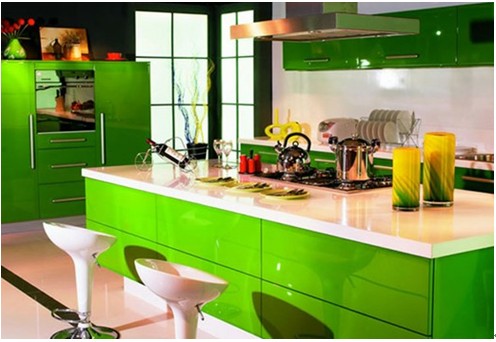 清新的明黃、嫩嫩的綠意、都無盡的透露著春意的到來,給生命已無數(shù)的期許。就讓充滿生命力的鮮活綠色走進(jìn)人們的廚房,豐富視覺的想象力。不同程度的綠色空間主題,可讓廚房空間氛圍鮮活跳躍??臻g色彩搭配上可選用暗藍(lán)色的涂料,在配合草綠色的櫥柜及同色系的餐具,可使整個(gè)空間輕松氛圍與穩(wěn)重氣息很好地結(jié)合起來,營造出一種輕松、明快的廚房環(huán)境。