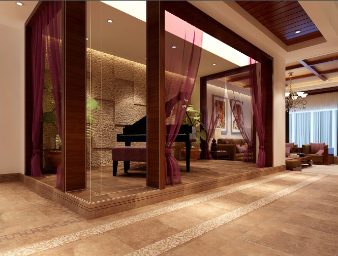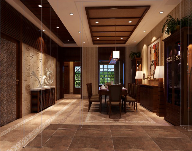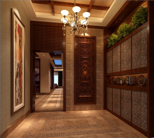 一進(jìn)門(mén)廳,就能讓你感到中式的那種氛圍,感到主人家的居家品位。門(mén)廳的對(duì)面是墻上是一個(gè)很有中國(guó)傳統(tǒng)特色的門(mén)雕花格窗,門(mén)廳的鞋柜是用來(lái)給主人回家及出門(mén)方便的一個(gè)鞋帽柜,鞋柜用花梨木做的框架,柜與柜之間留35公分的裝飾格,柜里留燈管槽位,里面可以擺些各種各樣的裝飾物品,鞋柜的頂上可以放好幾盆植物,燈光一打效果更加明顯。門(mén)頂?shù)捻斠彩菢O顯中式元素,頂周?chē)咭蝗δ揪€,中間是6*6木方做的線條造型。地面用的是仿古地磚中用馬賽克做的方形拼花。