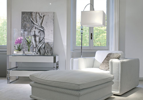 右側(cè)單人沙發(fā)Soft Couture和配套的方形坐墩,白色真皮手縫圖案。沙發(fā)參考價格10000元,坐墩參考價格50000元??繅γ鏀[放的是咖啡桌Oscar,金屬結(jié)構(gòu)配有白色上漆抽屜。參考價格77000元。窗前落地?zé)鬜ound參考價格37000元。