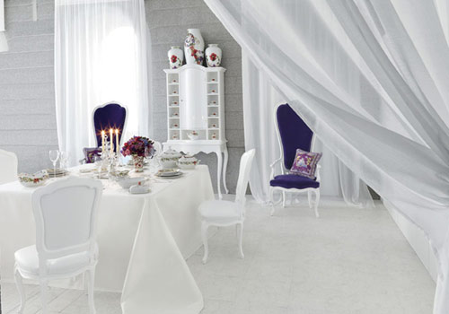 餐桌遠端擺放實木扶手椅Queen Dotsenko:白色上漆結(jié)構(gòu),軟包椅面和靠背外覆藍色天鵝絲絨面料。參考價格60000元。餐桌上擺放與Rosenthal合作生產(chǎn)的手繪陶瓷餐具Flower Fantasy。價格580元起。