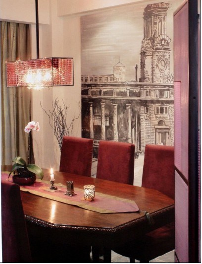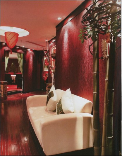 以上圖片可以明顯看出,紅色、米色、淡綠三色為主色調(diào):深紅色背景色大面積占去室內(nèi)空間。如地板、墻面、天花和大面積隔斷等色彩。背景色決定著整個(gè)居室空間的色彩基調(diào)。大多數(shù)場合背景色多為柔和的灰調(diào)色彩,可形成和諧的氣氛背景。如果在用色上選用了艷麗的背景色,將會(huì)給人留下深刻的印象。
