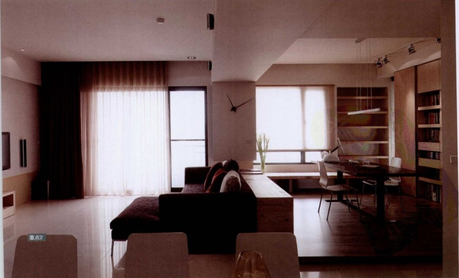 原本無用的走道,經(jīng)設(shè)計師的重新規(guī)劃,成為喜愛閱讀的屋主最流連的空間。相比于其它空間,書房對于屋主是重要的生活場所。開放式書房與客廳之間的連接,不僅僅在于延伸至窗臺的L形矮柜,架高的地板也能營造空間的層次感,而窗臺坐臥處讓書房的功能更為豐富。以L形書墻串連書房及走道,成為動線的引導(dǎo),也為屋主創(chuàng)造出足夠的收納空間,同時賦予單調(diào)走道更多的功能。