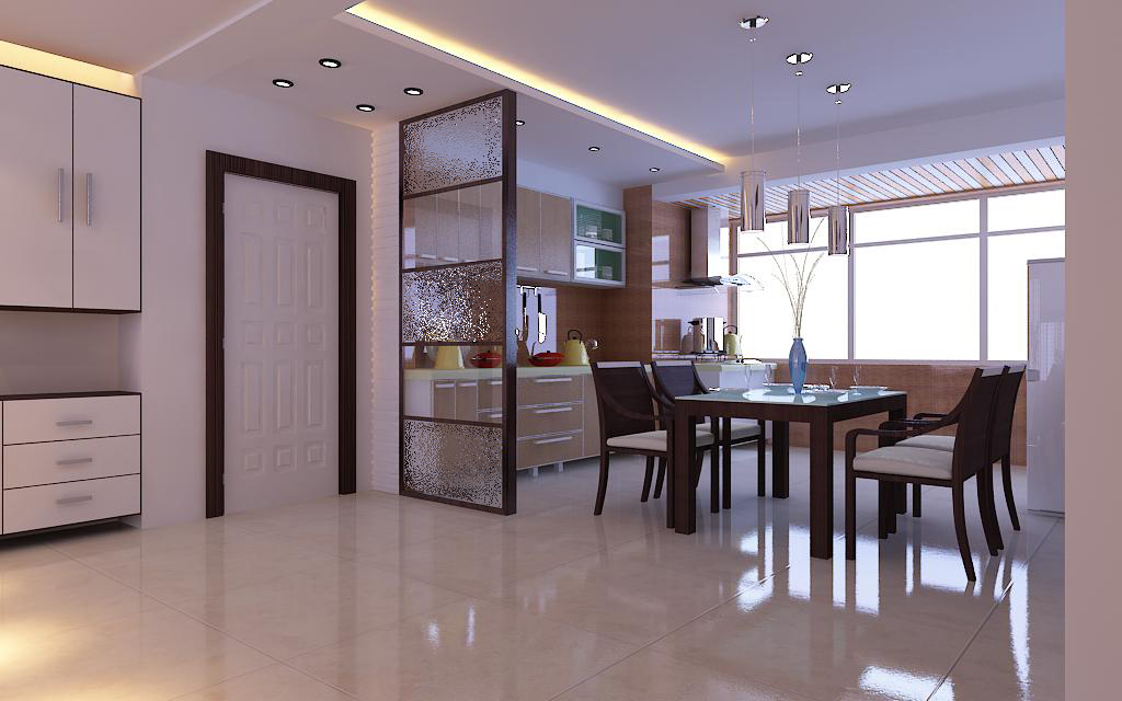 此戶型沒有放餐桌的位置,怎么擺放餐桌都沒有位置,廚房的面積也不大,最好的辦法就是把廚房的墻打掉做成開放式的廚房,客廳與餐廳僅用一個玻璃屏風(fēng)做隔墻,再就是把廚房陽臺的墻打掉與廚房相連,陽臺頂上吊條形的鋁扣板頂。廚房的柜體都是采用防火板?,F(xiàn)在市場上用的最多的就是防火板了,因為他是整體櫥柜的主流用材,基材為密度板,表面飾以防火板。廚房的頂部做了簡單的直線的石膏板吊頂。呵呵,這樣看廚房里面加放了餐桌是不是也顯得不擁擠了呢?是不是感覺明顯的加大了不少,餐廳的燈光很重要既不能太強又不能太弱,燈光則以溫馨和暖的黃色為基調(diào),再在上面掛幾個不銹鋼吊頂是不是顯得很大方呢?餐廳旁邊的墻上滿墻涂刷暖色調(diào)的藝術(shù)涂料并掛兩幅藝術(shù)油畫,再配上頂部照下來的燈光,廚房一下子暖意起來了,平時主人在這吃飯的時候也增加了食欲。餐廳的地面鋪的是600*600的拋光磚,一直延伸到客廳。