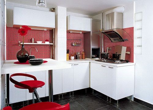 走進廚房3處紅色格子的背景墻非常搶眼,與白色的L型櫥柜結(jié)合清新整潔,墻上架起的白色桌板,兩旁擺放的紅色吧凳,立刻劃分出快捷便利的用餐區(qū)。