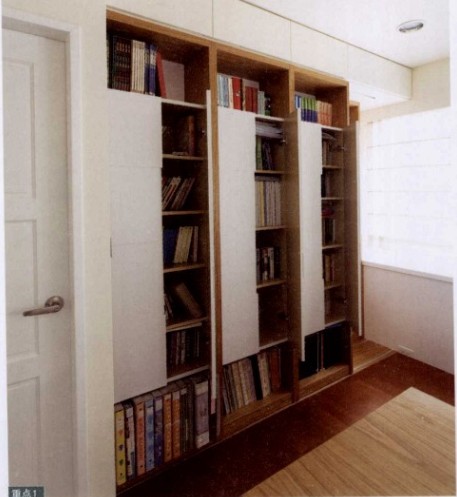 一開(kāi)始,是想把書房也做在臥室里,這個(gè)房間作為父母來(lái)小住的空間。但是書實(shí)在太多了,對(duì)于愛(ài)書的男主人來(lái)說(shuō),書籍的收納絕對(duì)需要解決的問(wèn)題。僅僅單面的書柜都是無(wú)法滿足需求,于是設(shè)計(jì)師便 設(shè)計(jì)了雙層書柜,除了外層柜的門片外,柜體同時(shí)也是移動(dòng)的門片。