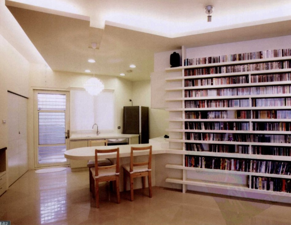 屋主收藏大量的CD片,于是設計師將CD片從收藏品躍升為家中的擺飾,讓CD片收納架成為客廳墻面最搶眼的裝飾,同時也考慮到屋主隨時取用的便利性。