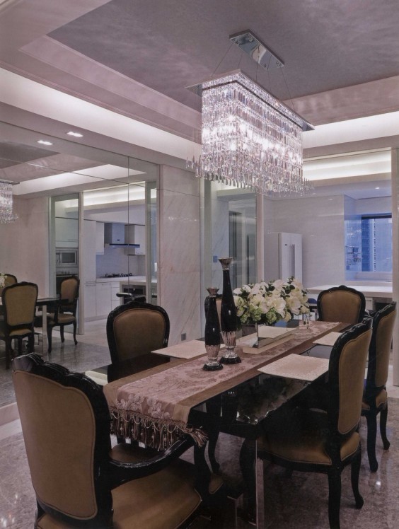 餐廳里運(yùn)用了大量鏡飾裝飾,這一扇墻面都是。在鏡飾的裝飾效果下,整個(gè)空間里亮度極限提升,再加上那個(gè)精美的水晶吊燈餐廳里典雅高貴的感覺(jué)一下子就出來(lái)了,低調(diào)的高雅就是指這里。