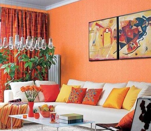 沙發(fā)背景墻面以大面積的橙色裝飾,與窗簾的色彩保持一致,改變了居室的整體視覺效果;墻面裝飾著抽象的畫框,避免大面積的背景色不會太平庸,風格色系上也很和諧,一下轉(zhuǎn)變了客廳一角的整個感覺。