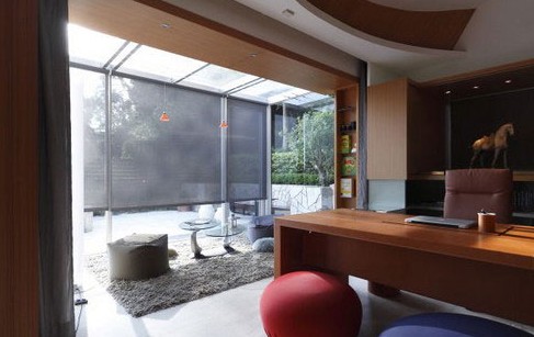 如果基地條件許可,不妨開天窗納入陽光,或是如本案贈(zèng)送日光屋,添加休閑感。這棟擁有英式莊園外觀及魅力庭院的別墅,別具巧思延伸出一扇透明之窗,因日光休閑屋的存在,形成內(nèi)外相互借景,室內(nèi)后現(xiàn)代藝?yán)纫庀笈c戶外清新庭院造景相互凝望。