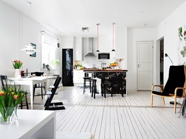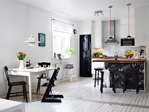黑白配無(wú)論是在時(shí)尚之都還是設(shè)計(jì)師的筆下都是永恒的經(jīng)典。本案的墻面與地面都大量運(yùn)用了白色,餐廚空間里在家具上運(yùn)用了黑色,搭配的結(jié)果是非常有品位的。從擺設(shè)上我們輕易能看出這是一個(gè)三口之家,餐桌旁邊那個(gè)貼心的兒童椅讓寶貝同父母一起用餐,心理學(xué)家說(shuō)這樣可以從小培養(yǎng)孩子的社會(huì)認(rèn)同感。