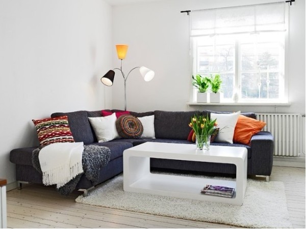 這是客廳的沙發(fā)。簡(jiǎn)約大氣的深色配以多彩的靠墊,很輕易就有了流動(dòng)感。深色系并不是冬日厚重的代名詞,在這里它不是更好的證明了嗎。