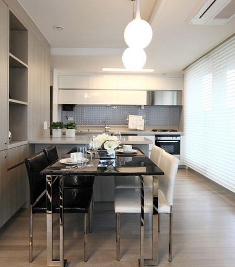 L型的飯桌腳設(shè)計(jì),讓飯桌更加堅(jiān)實(shí)牢固。大面積的落地玻璃窗,讓飯廳的采光更好,讓空間看起來更加寬敞開闊。假如家的坐向不理想,加入白色的百葉窗,阻擋部分陽光的同時(shí)部分陽光還是能滲透室內(nèi)。圓形的吊頂讓光線的涉及范圍更加大。