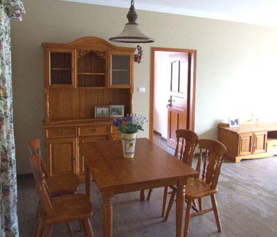 這是就餐區(qū),純實(shí)木的家具簡(jiǎn)潔而富有生活氣息,桌上依然少不了一盆綠色植物(不好意思,這植物在下實(shí)在也叫不出名字呀)。