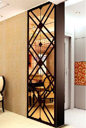 配電箱位于第二格玻璃后,即使玻璃上沒有任何裝飾,也能同時滿足遮擋配電箱和美觀的兩個要求,而玻璃上的雕花造型成為餐區(qū)的亮點。