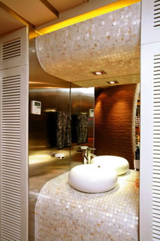 要想省空間,可以把洗手臺外置,和墻面找平就可以了。而找平的其他空間,完全可以用來儲納,當然,用來變圓形的四方角落也是制作儲納柜的好地方。