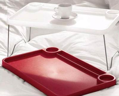 傳統(tǒng)的習(xí)慣是起床洗漱完畢后到餐廳吃早餐,可是有些戀床的人愿意用吃早餐來提神,仿佛吃完東西就有了起床的動(dòng)力。于是有些床附加了早餐臺(tái)的功能組件,防滑的臺(tái)面,邊緣的護(hù)欄,都提供了周到的硬件條件,甚至還有一些特別的“安全餐具”更利于餐具的放穩(wěn),于是一些便利的早餐便登上了床空間,成為床文化的一部分