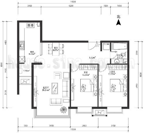 2、起居室外飄陽(yáng)臺(tái)三面采光,最大限度的將陽(yáng)光攬入室內(nèi)。