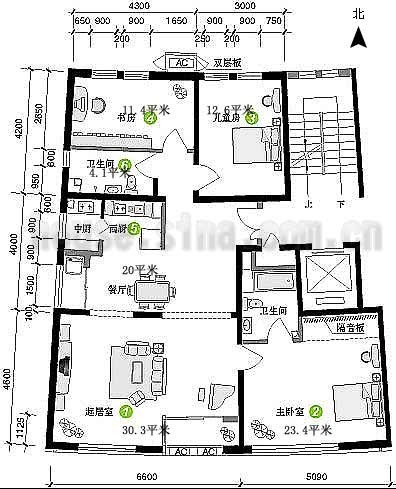 2.起居室面寬6.6米,進深4.6米,空間寬敞,與餐廳、門廳功能分區(qū)明顯。
