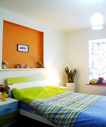 1、擱板無處不在,床頭墻壁的上方也可以用擱板,放置一些精美的擺設或者小型的花卉盆景等,下面可以掛照片或者裝飾畫等,讓墻壁不再單調。