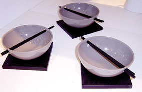 更值得一提的是這家店里的調(diào)料瓶的設(shè)計(jì),完全顛覆了傳統(tǒng)瓶瓶罐罐給人的單調(diào)和油膩的感覺(jué)。有的是兩個(gè)等高的亞光錫制圓柱體小容器立在胡桃木的木制底托上,造型和顏色的搭配表現(xiàn)出明顯的西方設(shè)計(jì)的嚴(yán)謹(jǐn)和藝術(shù)性。兩個(gè)小容器的頂部鑿上幾個(gè)小孔,就是兩個(gè)精致的鹽罐和胡椒罐。還有的是兩外立蛋式的小圓容器,同樣的財(cái)質(zhì)和色澤中間可以分開(kāi),也是放調(diào)味品的。還有的乍一看是橢圓柱體的白色瓷瓶,再一看,原來(lái)是兩個(gè)日月形狀疊加的,上端也有著同樣的小孔,也是兩個(gè)漂亮的調(diào)料瓶。也有的是兩個(gè)扁平蛋形的小白色瓷器,色澤盈潤(rùn),造型精致,有著東方設(shè)計(jì)的韻味,上面也有幾個(gè)小孔,也是調(diào)味瓶。這些小瓷器下面都有胡桃木的底墊,放置在桌上不失為精致的小飾品,而裝上了調(diào)味道料,就成了功能性極強(qiáng)的調(diào)味瓶,這樣的家飾品,哪個(gè)愛(ài)美的家庭主婦會(huì)不喜歡呢?