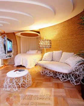 沙發(fā)、床都是定做的,主人很細(xì)心地把它們的支腳都配成了白色鋼絲纏繞的款式——整個(gè)房子如同大號(hào)的蠶繭,里面怎么能夠少了蠶絲呢?而電視的處理更值得稱道:省卻了大規(guī)模電視背景墻的空間,將它用鐵絲支架吊掛在空中,可以多方位旋轉(zhuǎn),無(wú)論洗澡、做飯還是座談、休憩,都可以隨時(shí)看到想看的節(jié)目,而且造價(jià)肯定比主題墻少。