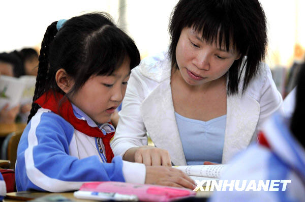 3月25日,班主任劉敏正在輔導(dǎo)魏玉潔做作業(yè)