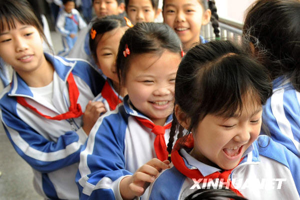 3月25日,魏玉潔(前右)與同學(xué)在一起開(kāi)心地游戲