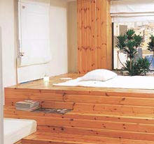 這是在獨(dú)身居所的房間里可以嘗試的創(chuàng)意。將地面增高至屋頂高度的一半左右,形成獨(dú)特的結(jié)構(gòu)。高出的地面和原來的地面之間,可以用階梯相連。這樣將空間分割成兩部分,底部用于收納,上部可以將其裝飾成臥室,還能享受到閣樓般的溫馨氣氛,可謂一舉兩得。在階梯的中間部位,放上一個(gè)大坐墊,就有了一個(gè)看似平平,卻很柔軟的休息空間了。