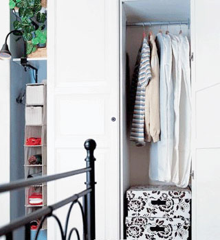衣柜和墻之間也有收納空間。在衣柜和墻之間的空當(dāng)里,用擱板打成隔斷,上部放置一些花草等綠色植物,讓臥室充滿春的感覺;下部可以懸掛一個儲物袋,放置小件的衣飾,如領(lǐng)帶、絲巾等。