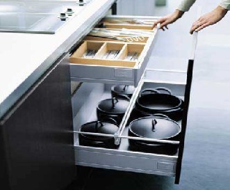 新型聯(lián)動(dòng)裝置取代了齒輪聯(lián)動(dòng),進(jìn)而誕生了櫥柜內(nèi)外雙置物架,這種雙置物架有個(gè)可愛的名字,叫做“怪物籃”?!肮治锘@”的門上有一些存放物品的置物架,打開柜門,聯(lián)動(dòng)裝置會將柜體深處更大的金屬物架一并帶出,整個(gè)柜子里的物品便一目了然,上年紀(jì)的人找東西再也不必蹲下甚至跪下身子了。同時(shí),側(cè)板還分擔(dān)了鉸鏈的負(fù)荷,結(jié)構(gòu)更加牢固。